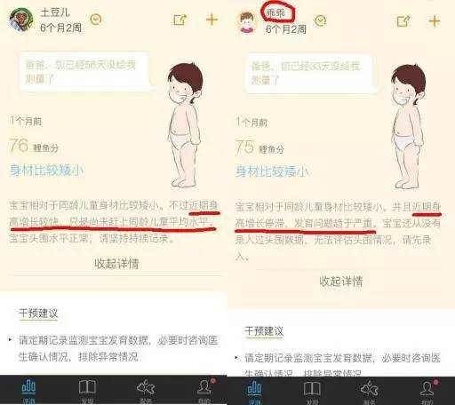 从上图我们可以看出来,土豆和乖乖的月龄完全相同,鲤鱼分也十分接近,而关于两个宝宝生长发育的解读却大相径庭:土豆正在快速生长,努力赶超,而乖乖身高增长停滞,可能出现了比较严重的问题。