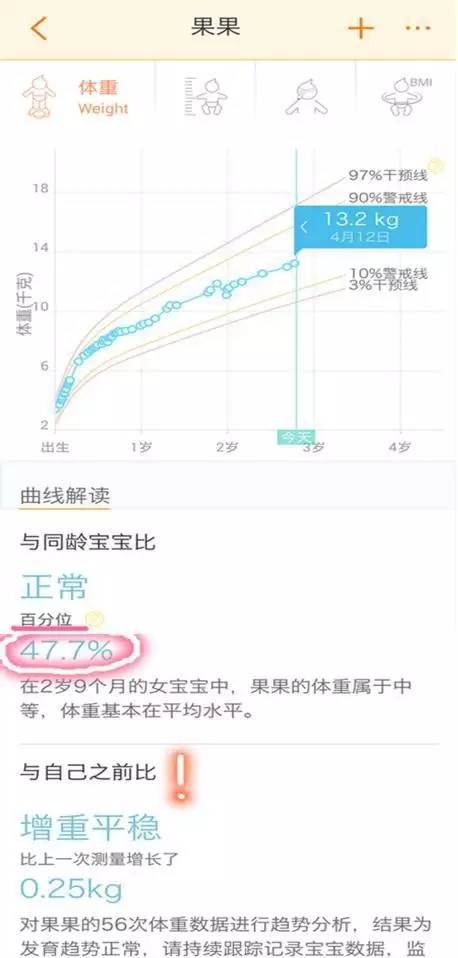 我们以上图果果宝宝的体重曲线为例(根据家长录入的身长、体重、头围的数据,小鲤鱼育儿APP中会自动生成属于您宝宝的身长曲线、体重曲线、头围曲线和代表宝宝匀称性的四条曲线),大家可以看图片上标红的数字“47.7%”,这个指的就是百分位,如果同月龄的100个小朋友按照体重从轻到重排队,果果排在第47-48的位置上。
