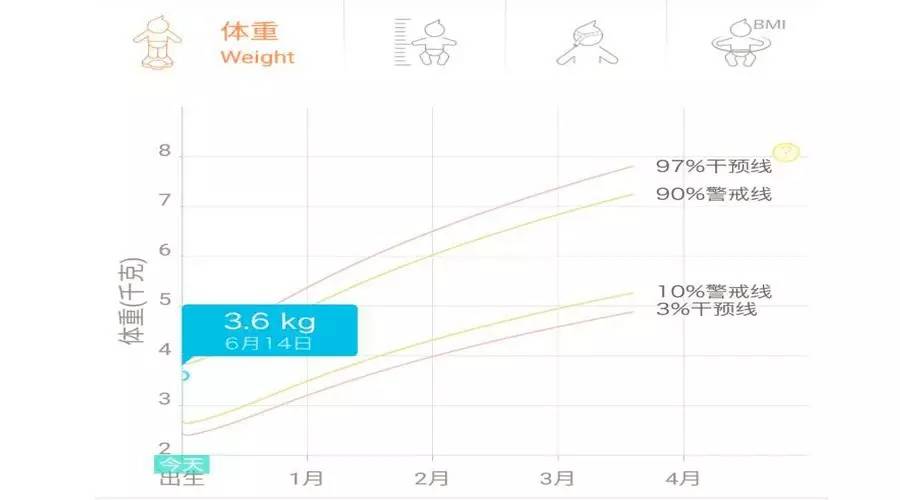曲线图由若干条连续的曲线组成,在我们小鲤鱼的APP中,我们可以看到生成的曲线图上有4条参考线,从下到上依次是:第3百分位(3%干预线)、第10百分位(10%警戒线)、第90百分位(90%警戒线)和第97百分位(97%干预线)。