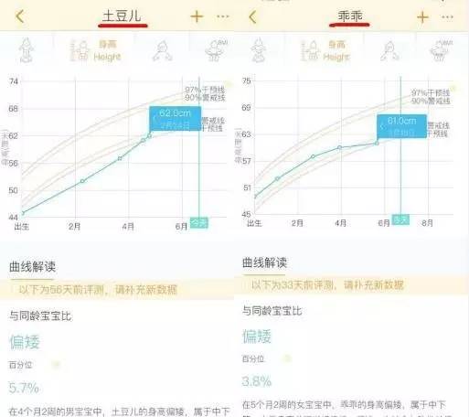 从曲线中,我们可以得到更加直观的感受:虽然土豆儿的出生身高偏低,但曲线的走势是“直线上升”的,到6个月2周,已经达到62cm;而乖乖从4个月开始,身高增长几乎停滞。