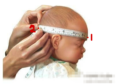 step 3:拿软尺从1点经2点再回到1点,所测得的最大距离就是宝宝的头围啦。