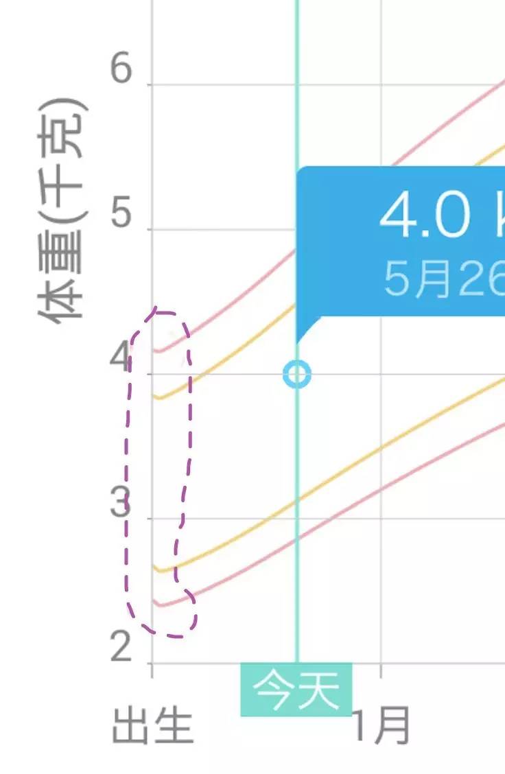 上图中用紫色虚线圈出的范围我们可以观察到曲线有向下的偏折,这就是生理性减重在生长发育曲线中的体现。一般情况下,宝宝一般在出生一周至10天内恢复出生体重。